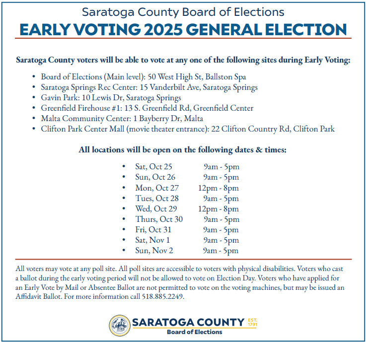 Early voting in Saratoga Springs lasts just eight days, beginning Saturday Oct. 25 and ending on Sunday Nov. 2. The General Election is Tuesday Nov. 4.