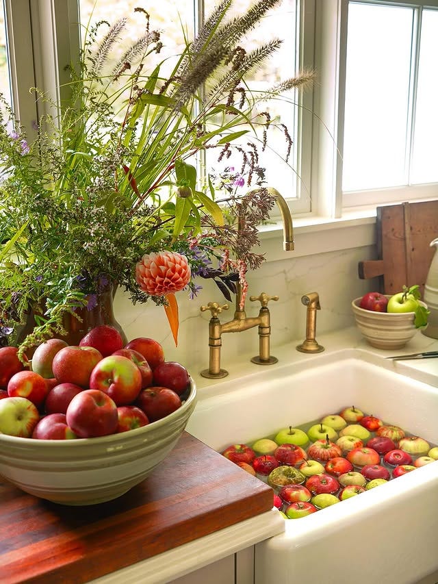 If you’re new to Khan’s brand, you’re in for an autumnal treat. She’s currently decorating with tomato vines from her garden and heirloom blooms foraged from a nearby farm, and is in love with planting fall bulbs and the season’s “festive spirit.” She makes bakes pies with McIntosh apples from her property, hosts neighbors for an apple harvest celebration where they press cider, and even churns out old-fashioned apple cinnamon ice cream with her family.