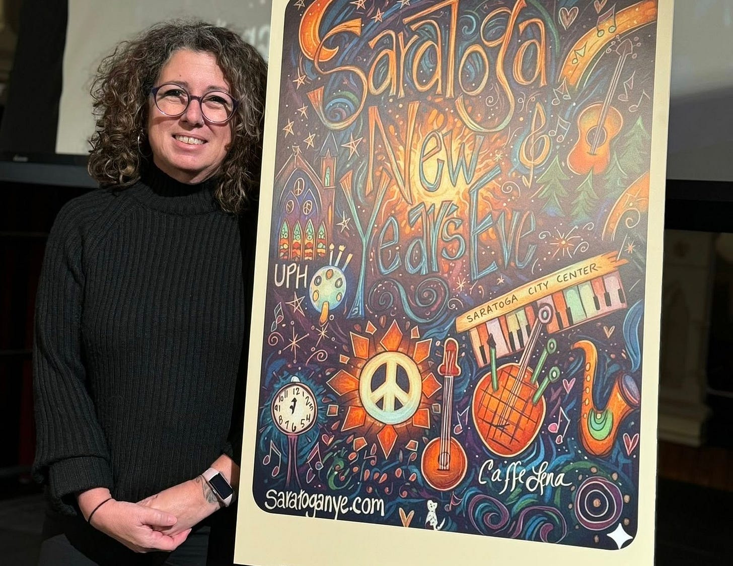 Reminiscent of the days of First Night Saratoga — a previous iteration of Saratoga NYE — this year’s festive event poster (featured on all ticket-holders’ admission buttons) was designed by a local artist: Saratogian Rebecca Vickery, sales manager for the Saratoga Springs City Center.