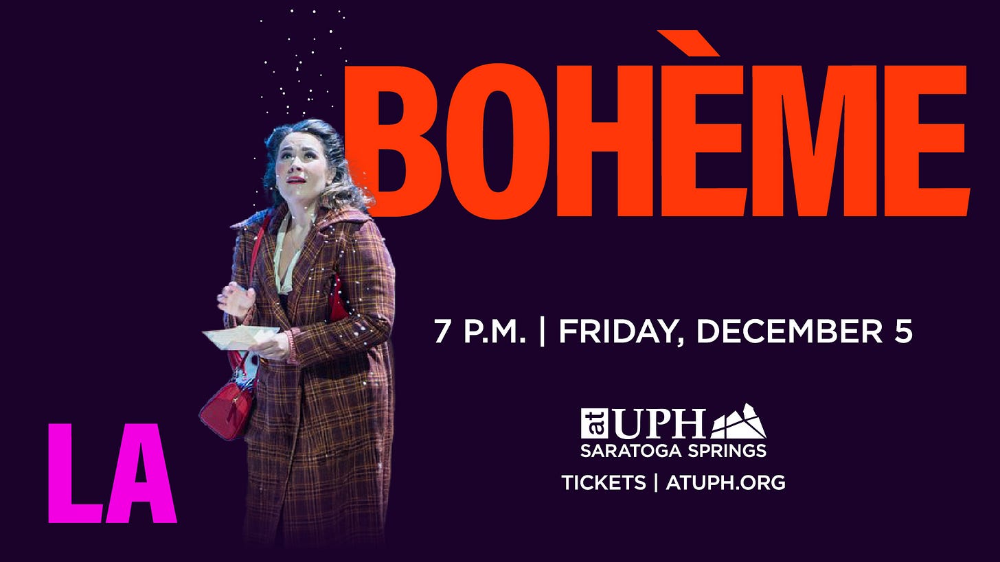 This column falls smack in the middle of Opera Saratoga’s roll-out announcement of its 2026 summer festival shows. So far? The musical Happy End — a huge New York State touring collab with Glimmerglass that we reported in July — now has its Saratoga dates (May 28 and 30). And…drumroll please…the Capital Region’s only professional opera company has added the romantic Elixir of Love (oh la la). There’s one more huge announcement coming this week — stay tuned!