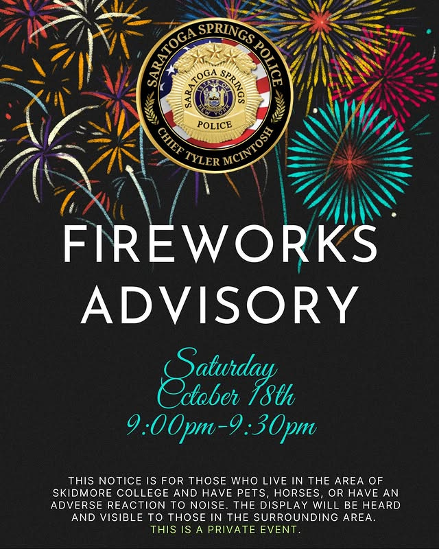That post to the Nextdoor app certainly caught our attention. Turns out it’s Family Weekend/Homecoming at Skidmore, and there are fireworks planned from 9 to 9:30 p.m. Saturday. So if you’ve got a skittish pup or other animal, you’ve been warned. And don’t “freak out” or call the police — they’re the ones spreading the advance word.