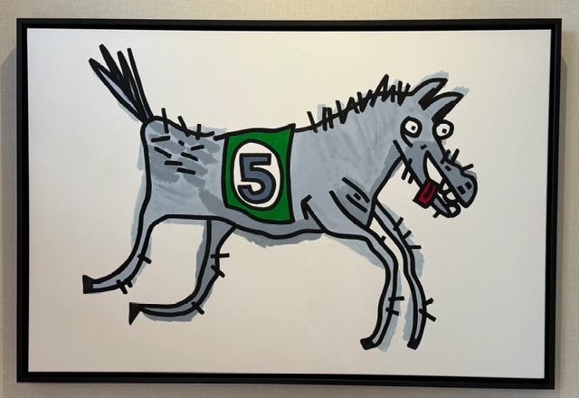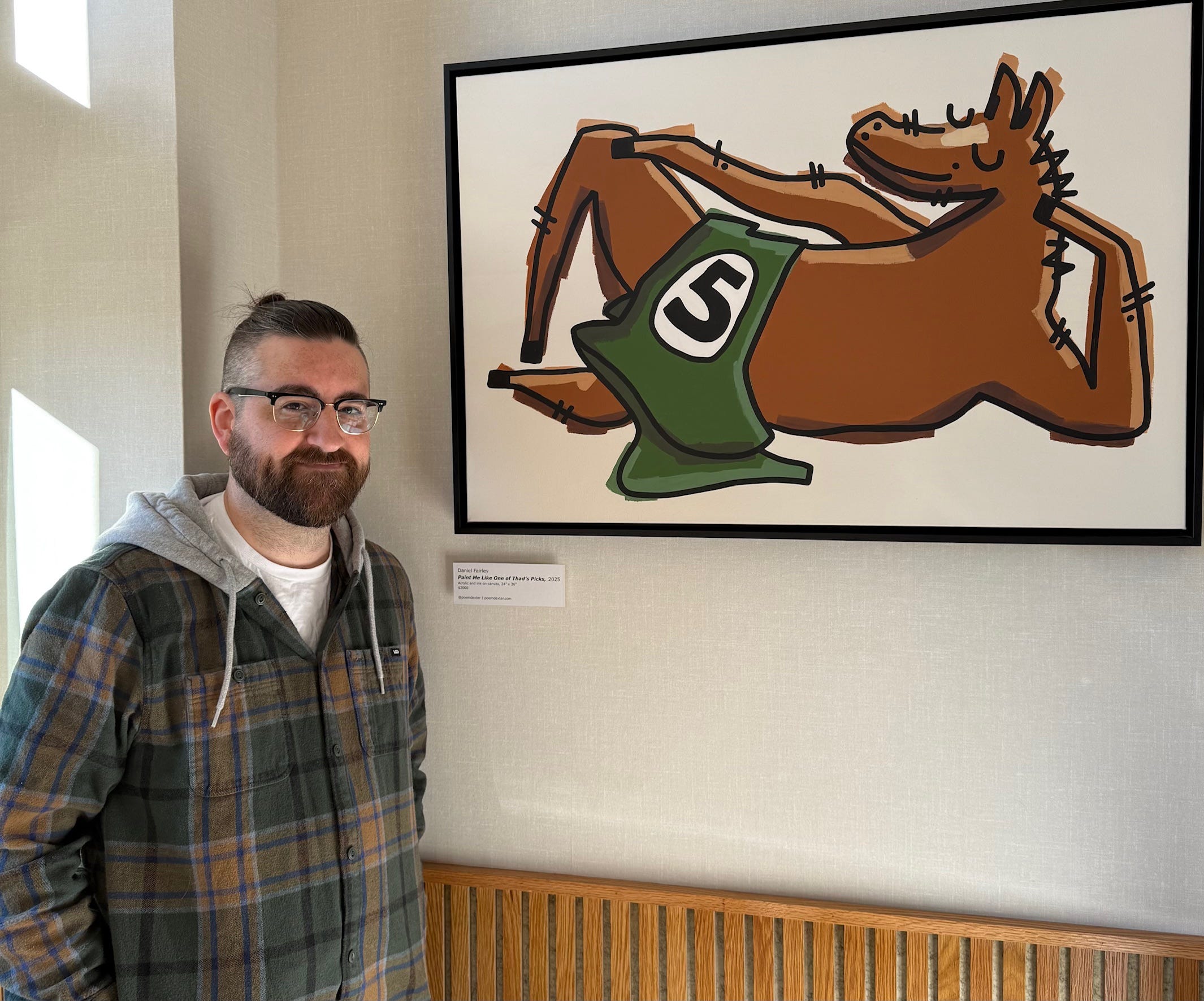 The horse paintings — 24” x 36” acrylic and ink on canvas — are about as far from a standard piece of Saratoga artwork as you can get, displaying a clever irreverence that is resonating with curious diners. The series is called “Thad’s Picks,” after Fairley’s father-in-law — Denham’s dad — who has gained a reputation for his terrible horse betting.