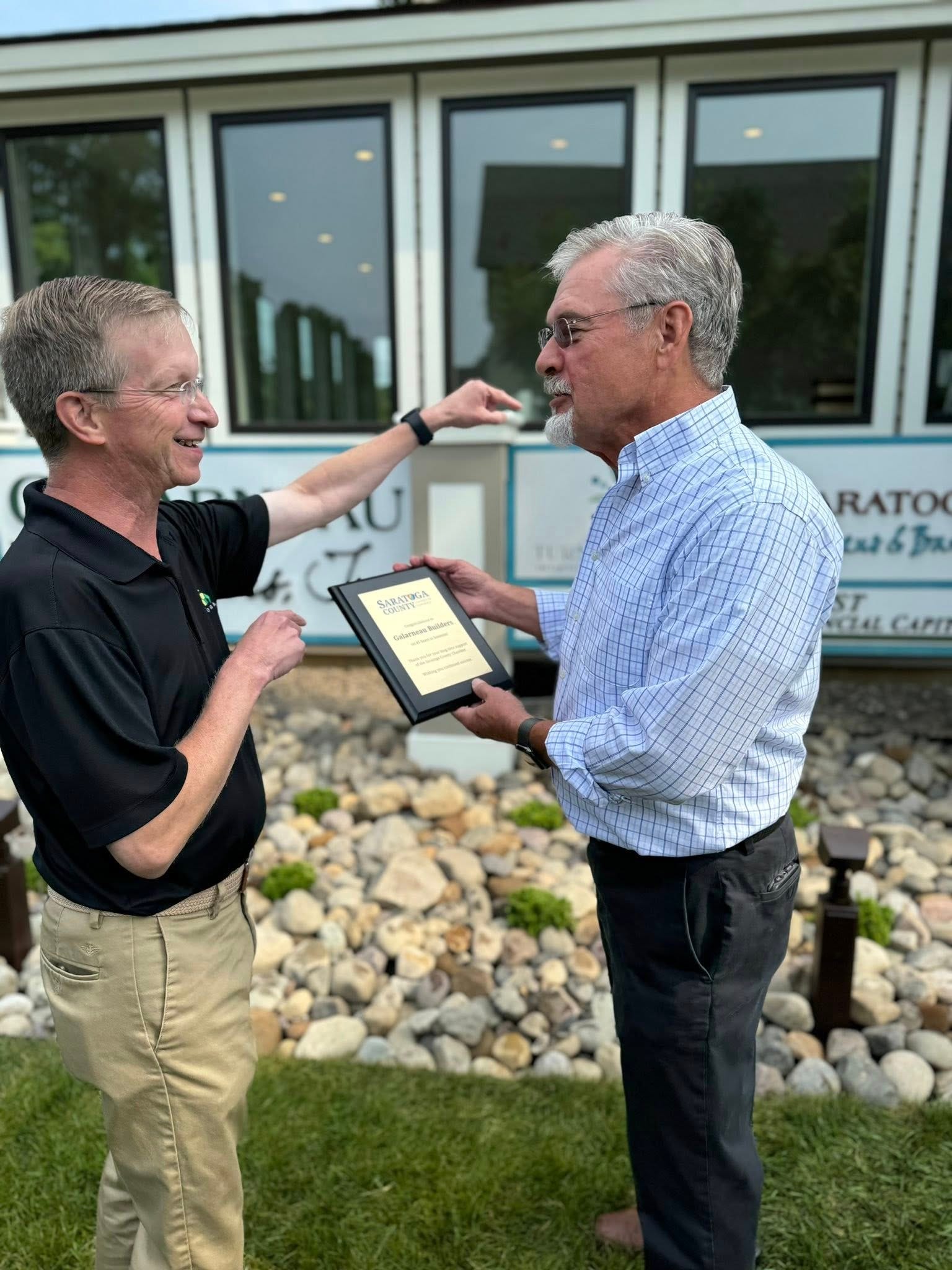 To mark its anniversary milestone, Galarneau Builders was recently presented with a plaque by Saratoga County Chamber of Commerce president Todd Shimkus, who congratulated Galarneau on a dream come true and wished him continued longevity for his company.