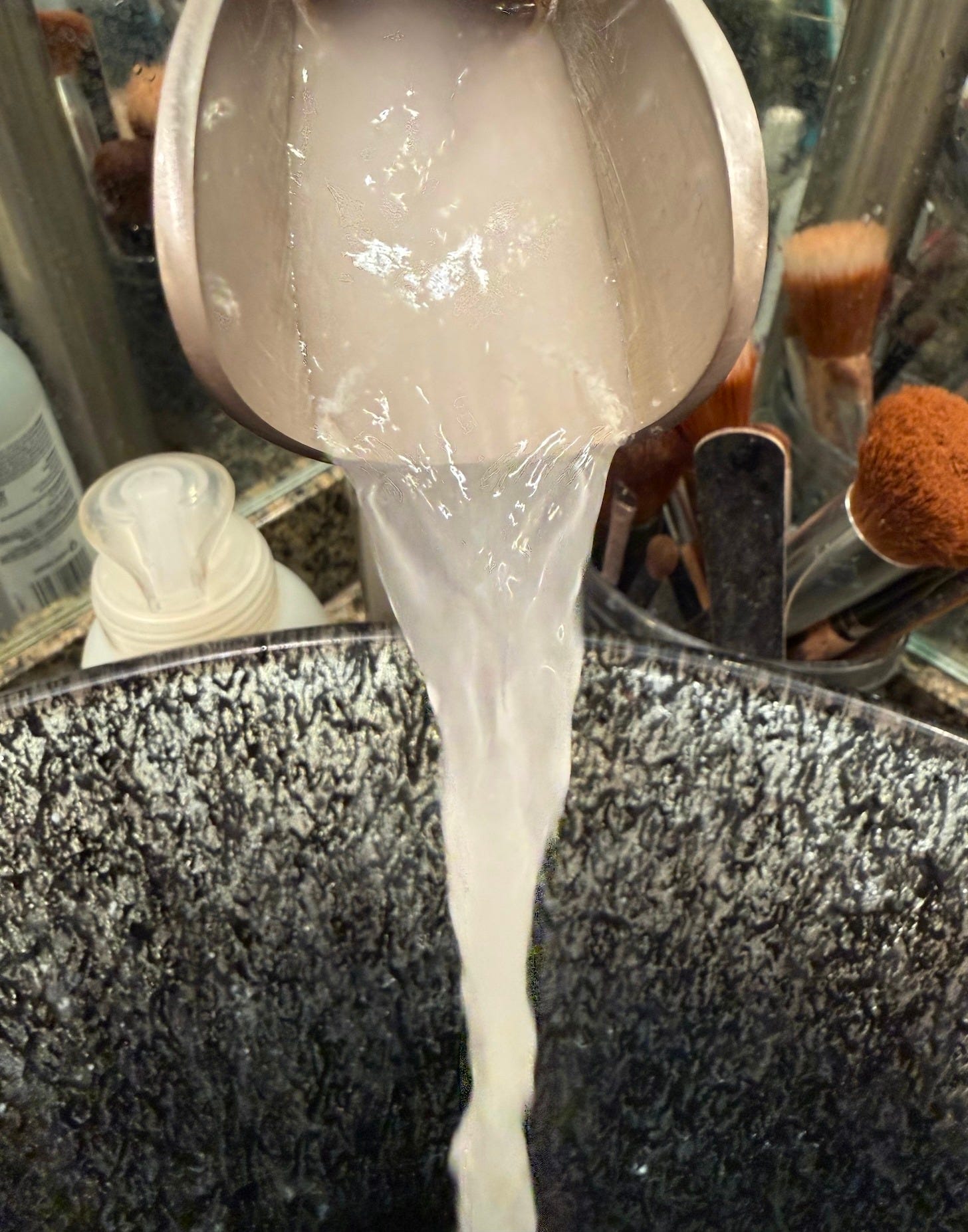 The crisis? Water that’s sometimes milky (see above) and can smell like “a faucet on your Clorox bottle!!!!,” according to one poster on Nextdoor.