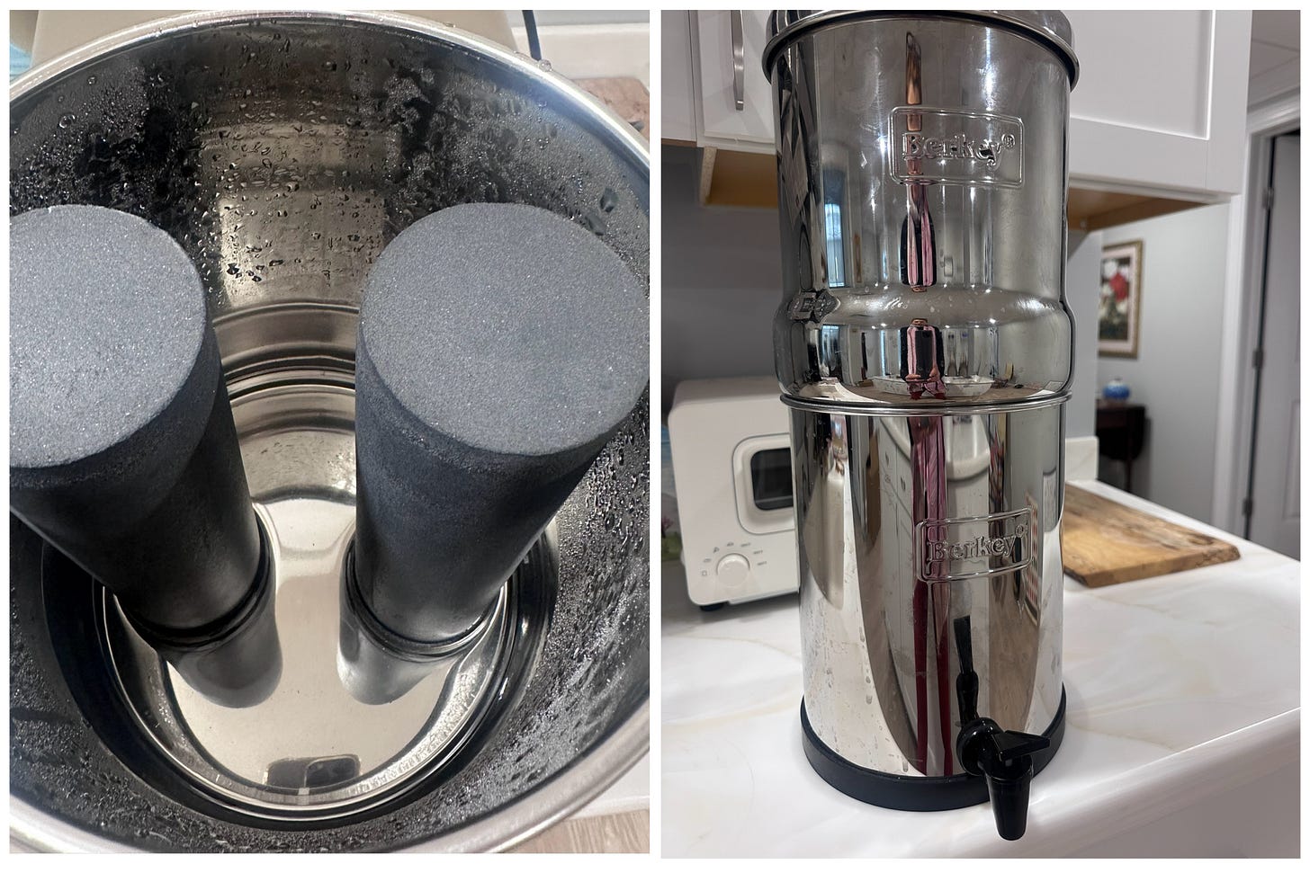 After multiple tries, and a little assistance, I got it together — myself mentally, then the Berkey — and after a few weeks of treating it like a weird spaceship that landed on our counter, my kids now faithfully use it for their drinking water, and I use it for my drinking and their cooking water.