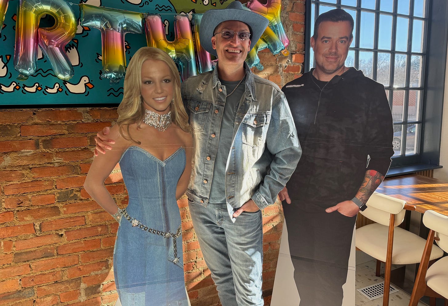 Saturday: Oh boy. Just after Phila Street hotspot Standard Fare announced that itâs now open for weekend brunch, it closed yesterday for co-owner Zac Denham and friends to party like it was 2001. With the birthday boy dressed up as Justin Timberlake at the AMAs, to match a cardboard cutout of Britney Spears the year they matched in head-to-toe denim. The cut-out was a gift from husband/co-owner Clark Gale. (âHe guessed right away,â he told me, laughing. âI was so mad. One of us is too predictable, but I donât know which one.â)