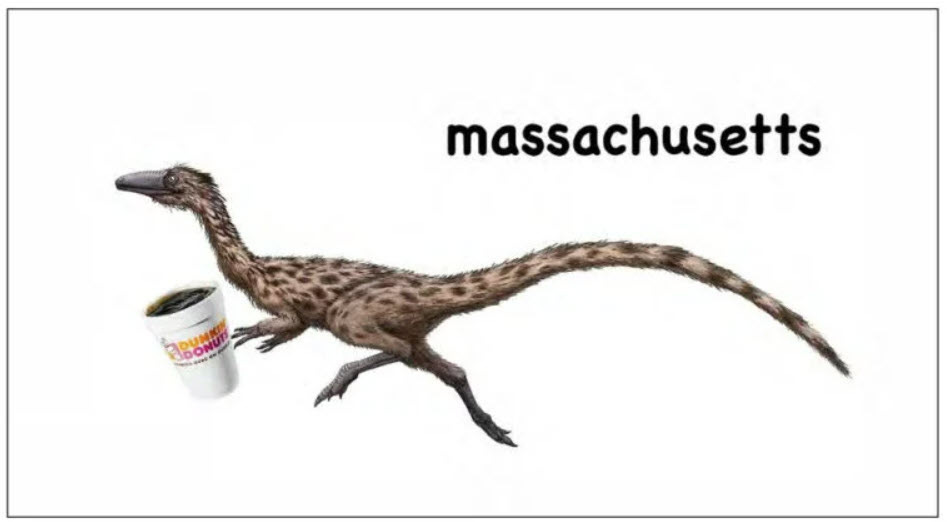 Well now, the Massachusetts Seal, Flag, and Motto Advisory Commission has faced a similar situation, says Boston.com, with recommendations for a new flag that include the scoreboard from a huge New England Patriots win, the colors of Dunkin’ Donuts (based in Massachusetts), and the state’s dinosaur in full sprint with a cup of Dunkin’ Donuts coffee, because, you know, everything runs on Dunkin’. Even dinosaurs.